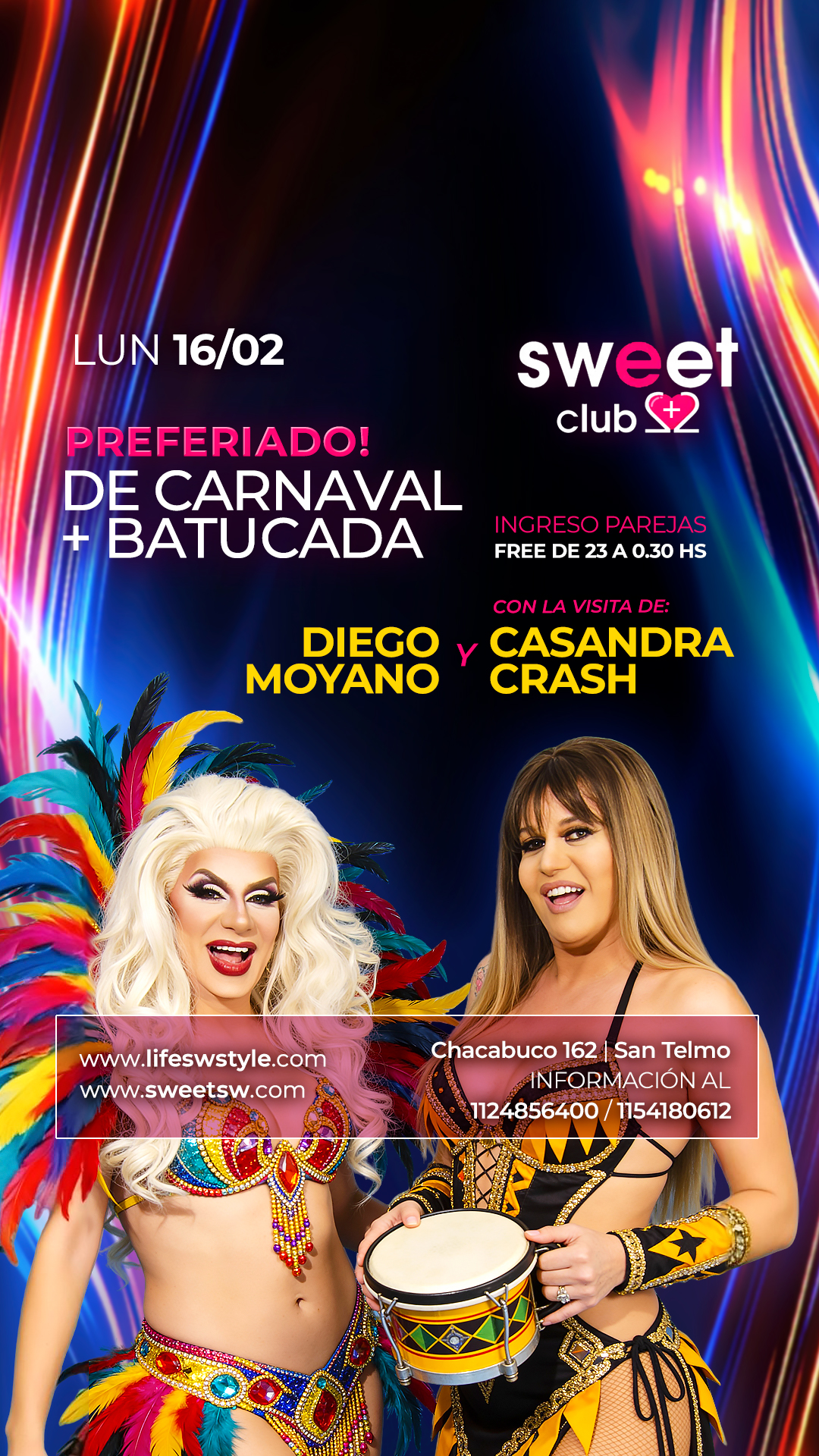 Una noche donde el ritmo te atraviesa, la batucada enciende la pista y la energía no se detiene. Plumas, brillo, piel y deseo mezclados en una fiesta que rompe todas las reglas.