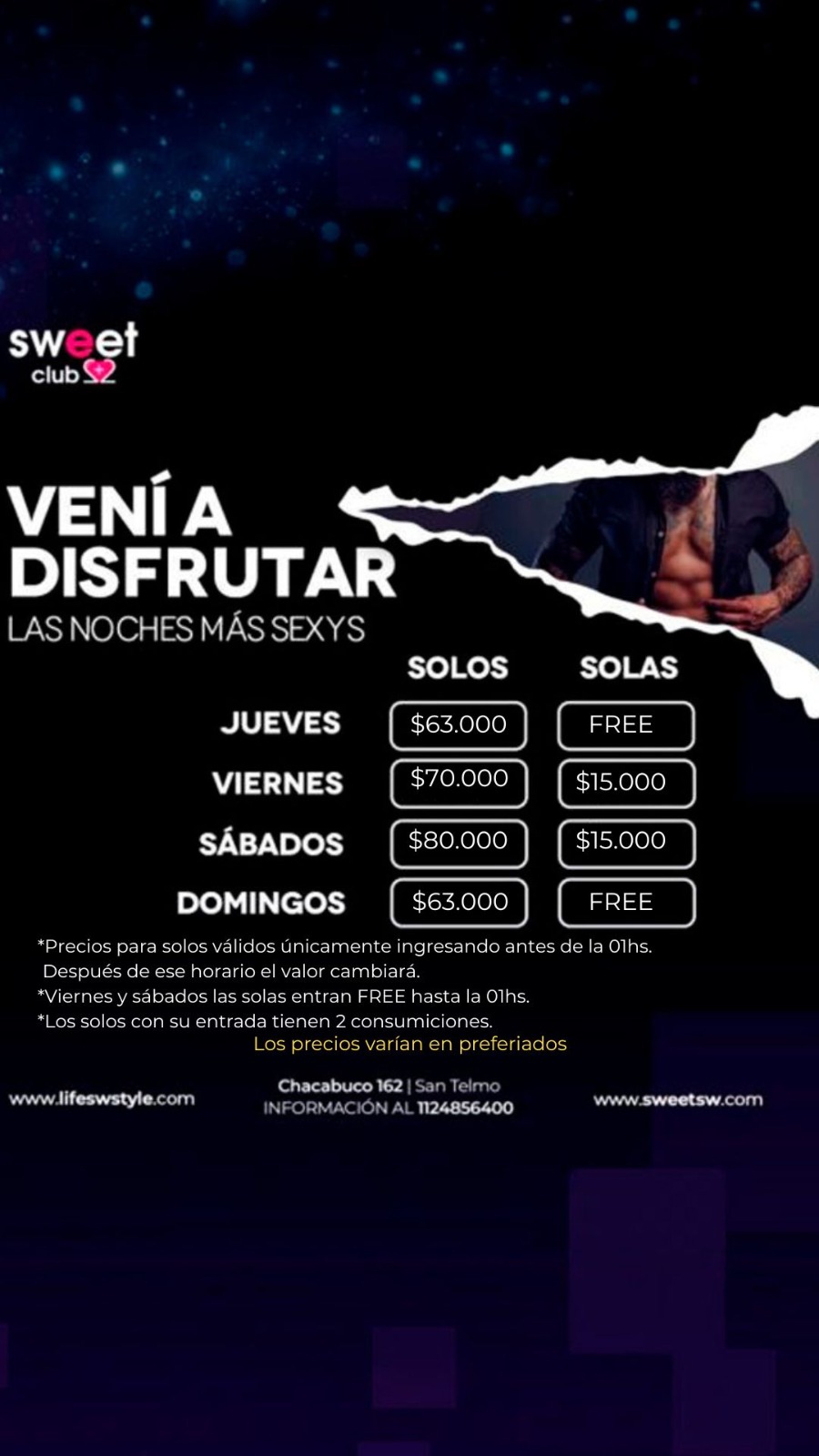 Sweet Club se ha posicionado como uno de los lugares más exclusivos y codiciados de San Telmo, gracias a su ambiente elegante y sensual, ideal para quienes buscan vivir experiencias inolvidables. Nuestras noches están diseñadas para ofrecerte diversión, música de primera, y un entorno seguro y acogedor donde puedas relajarte y disfrutar al máximo, ya sea que vengas solo o sola.